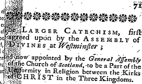 2.웨스트민스터 소요리문답: 영국의 웨스트민스터 총회에서 작성된 표준 문서 중 하나로, 1643년부터 허버트 팔머에게 작성을 지시해 1648년 의회 승인을 완료했다. 웨스트민스터 총회 위원회는 처음에 신앙고백과 요리문답들을 동시에 준비했으나, 얼마 진행한 후 우선 신앙고백서를 필하고, 그것을 표준으로 삼아 요리문답들을 작성하기로 결의했다. 1646년 12월 3일에 완성된 웨스트민스터 신앙고백서를 회의의 이름으로 국회에 제출했고, 국회는 그 각 부분에 성경구절을 난외(欄外)에 방주(傍註)를 달라고 지시했다. 회의는 마침내 각 명제에 대한 성경구절을 완전히 첨부해서 1647년 4월 29일에 의회에 보고했다.
